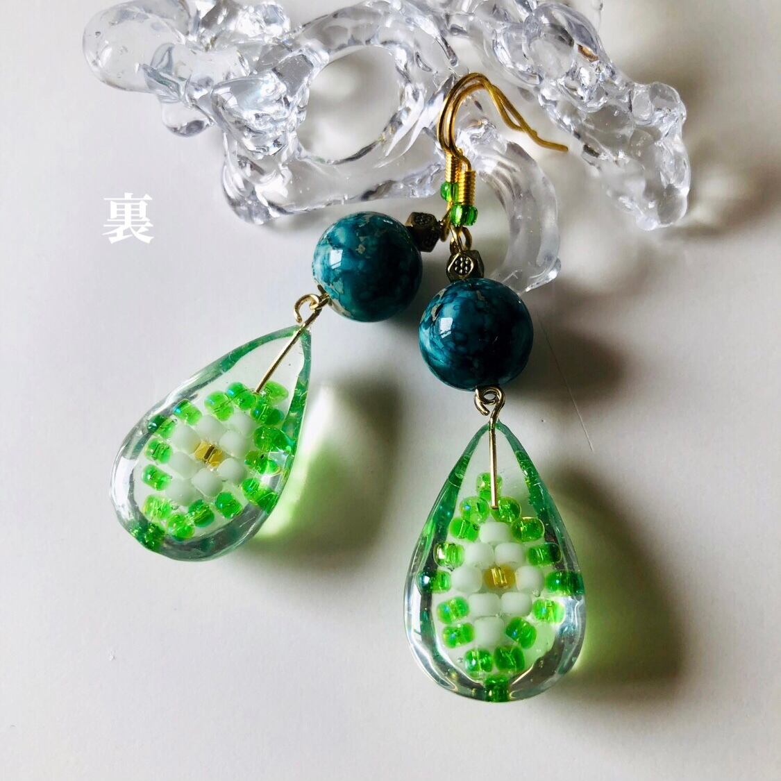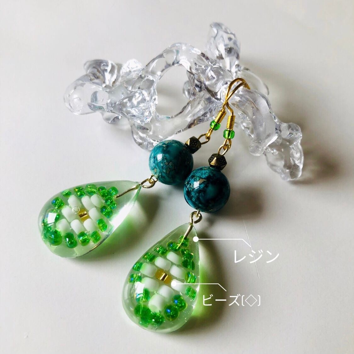 クリアレジンにグリーンビーズで作ったひし形を閉じ込めました‧˚₊*̥