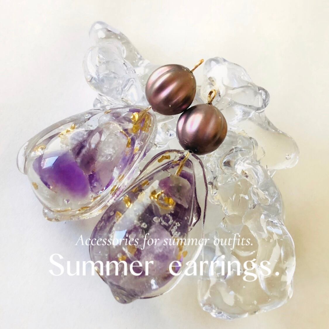 今回は、氷に見立てたレジンの中に紫水晶を閉じ込めてみました。